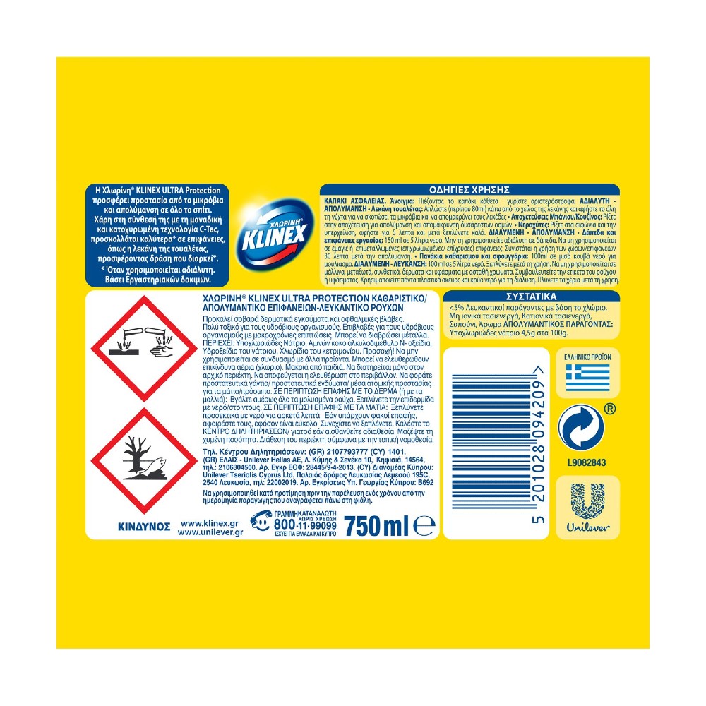 Πληροφορίες Προϊόντος Σύνθεση <5% λευκαντικοί παράγοντες με βάση το χλώριο, μη ιονικά τασιενεργά, κατιονικά τασιενεργά, σαπούνι, άρωμα. Απολυμαντικός παράγοντας: υποχλωριώδες νάτριο 4,5g / 100g. Οδηγίες…