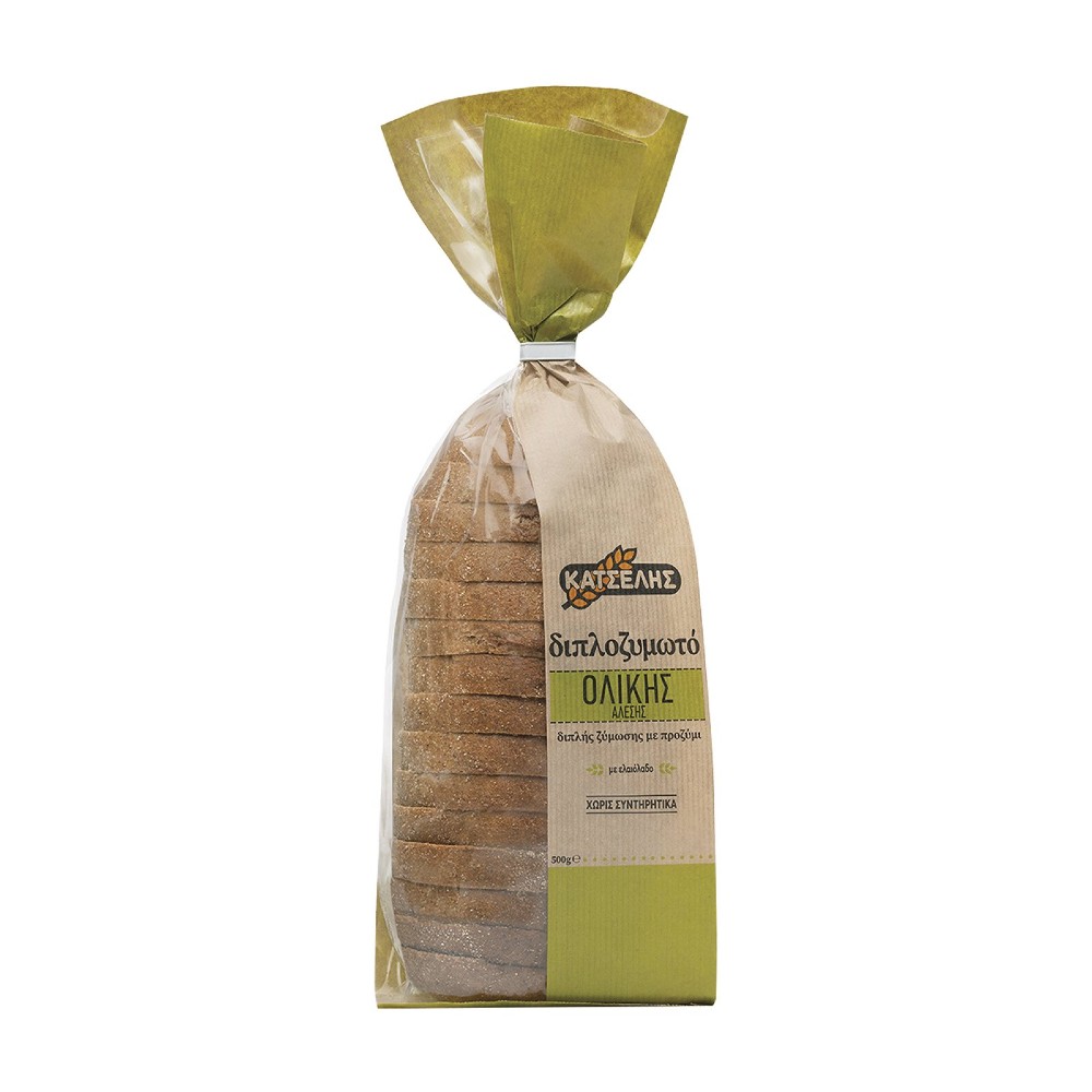 Ψωμί σε φέτες προζυμένιο με αλεύρι ολικής άλεσης πετρόμυλου από σκληρό και μαλακό σιτάρι και ελαιόλαδο, παστεριωμένο.